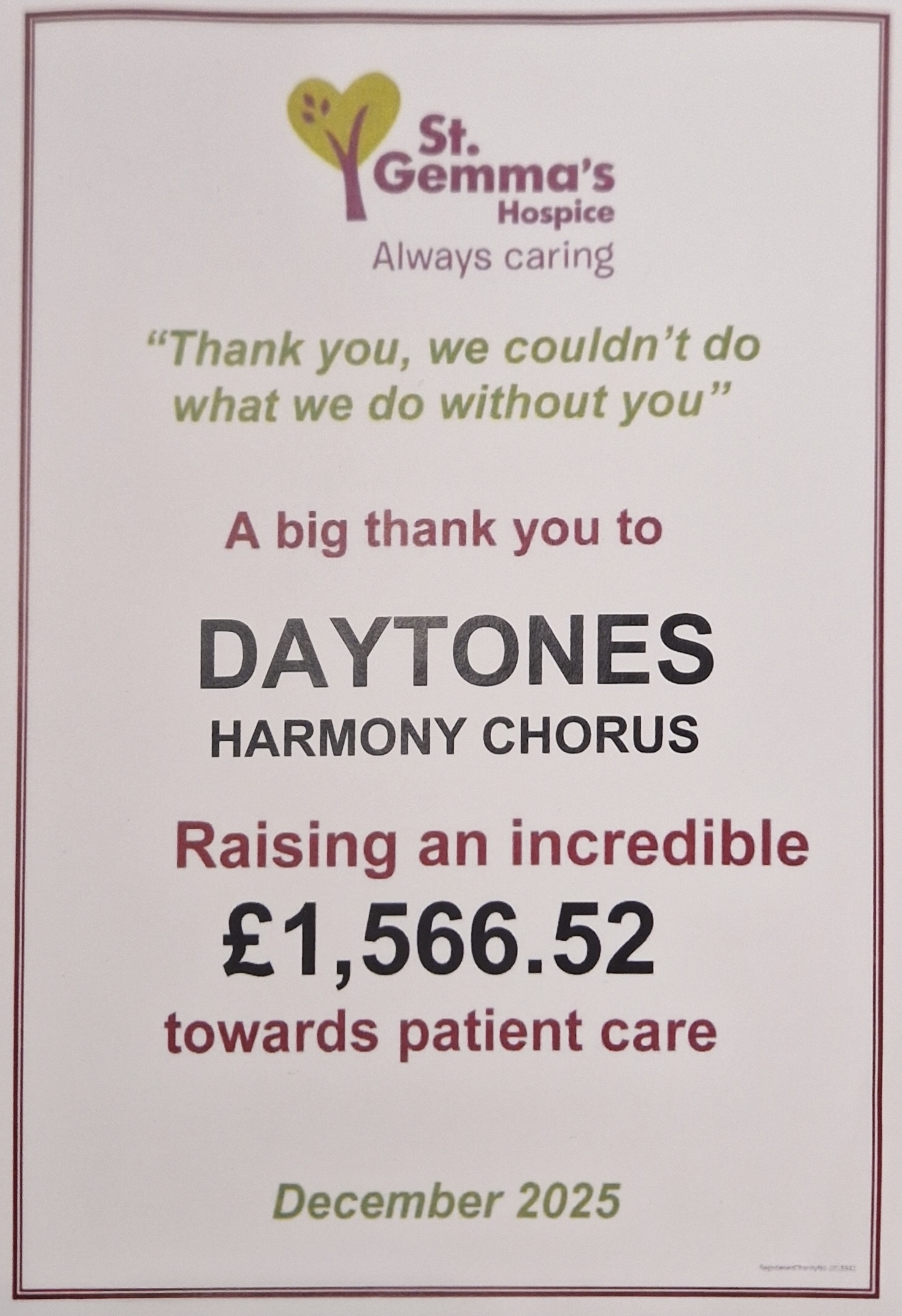 In 2025 alone we gave over £1560 to St Gemma's hospice in Leeds and over £860 to the children's hospice Martin House in Boston Spa.